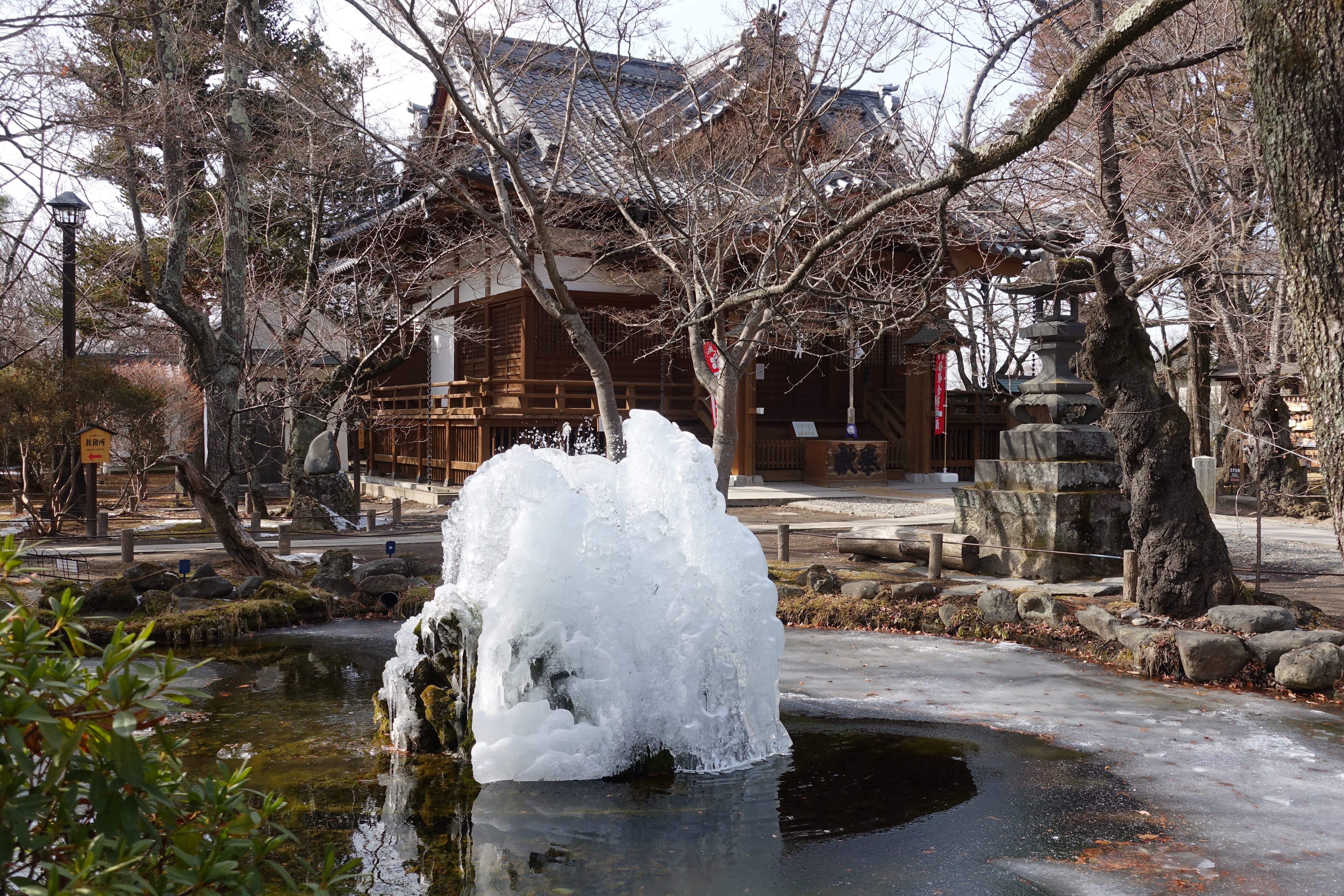 懐古神社と噴水 噴水は凍結