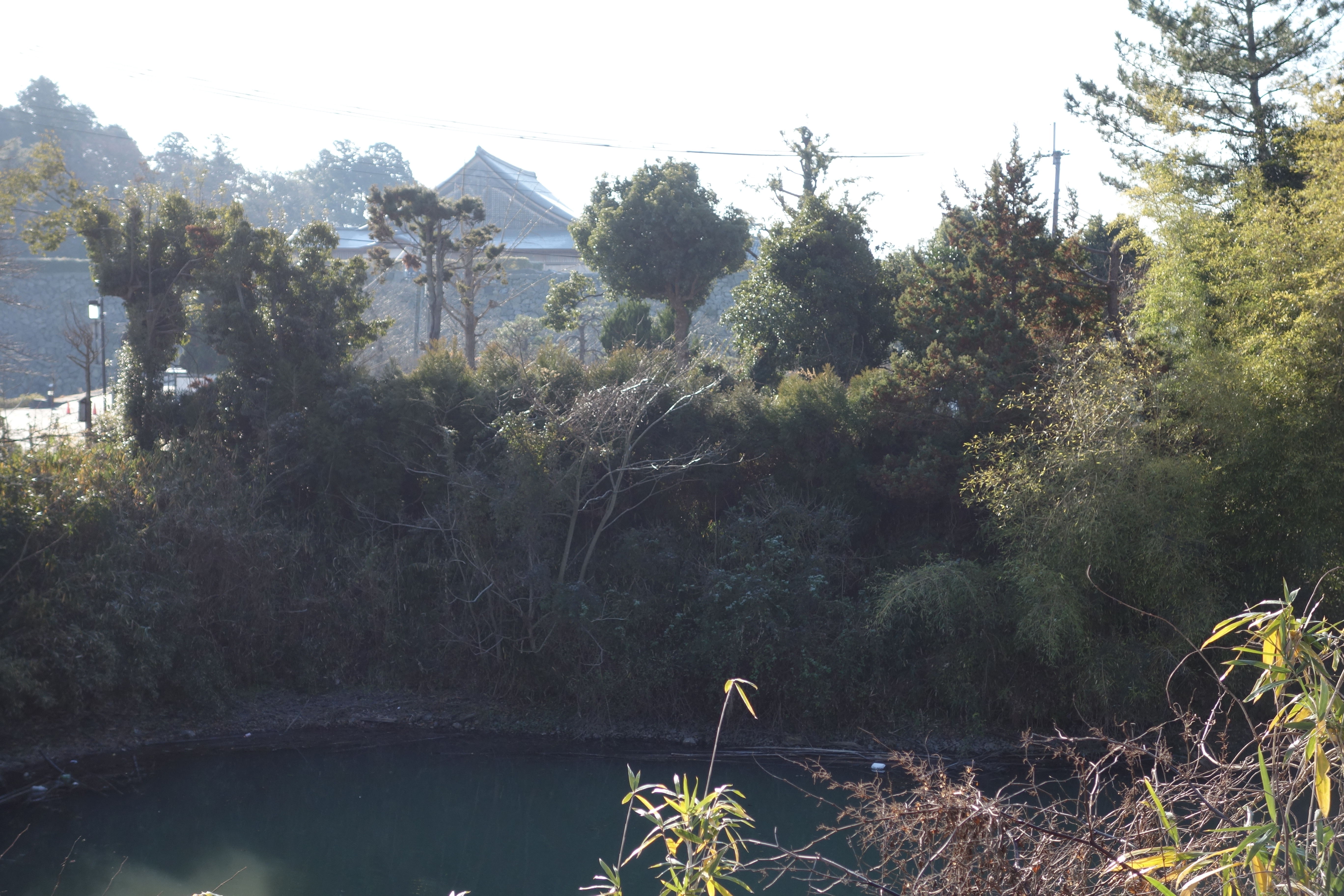 大手馬出し跡(水掘は見らず)近辺から大手門方面 外堀を挟んで三の丸 更にその内側の二の丸に在る大書院の屋根 |
