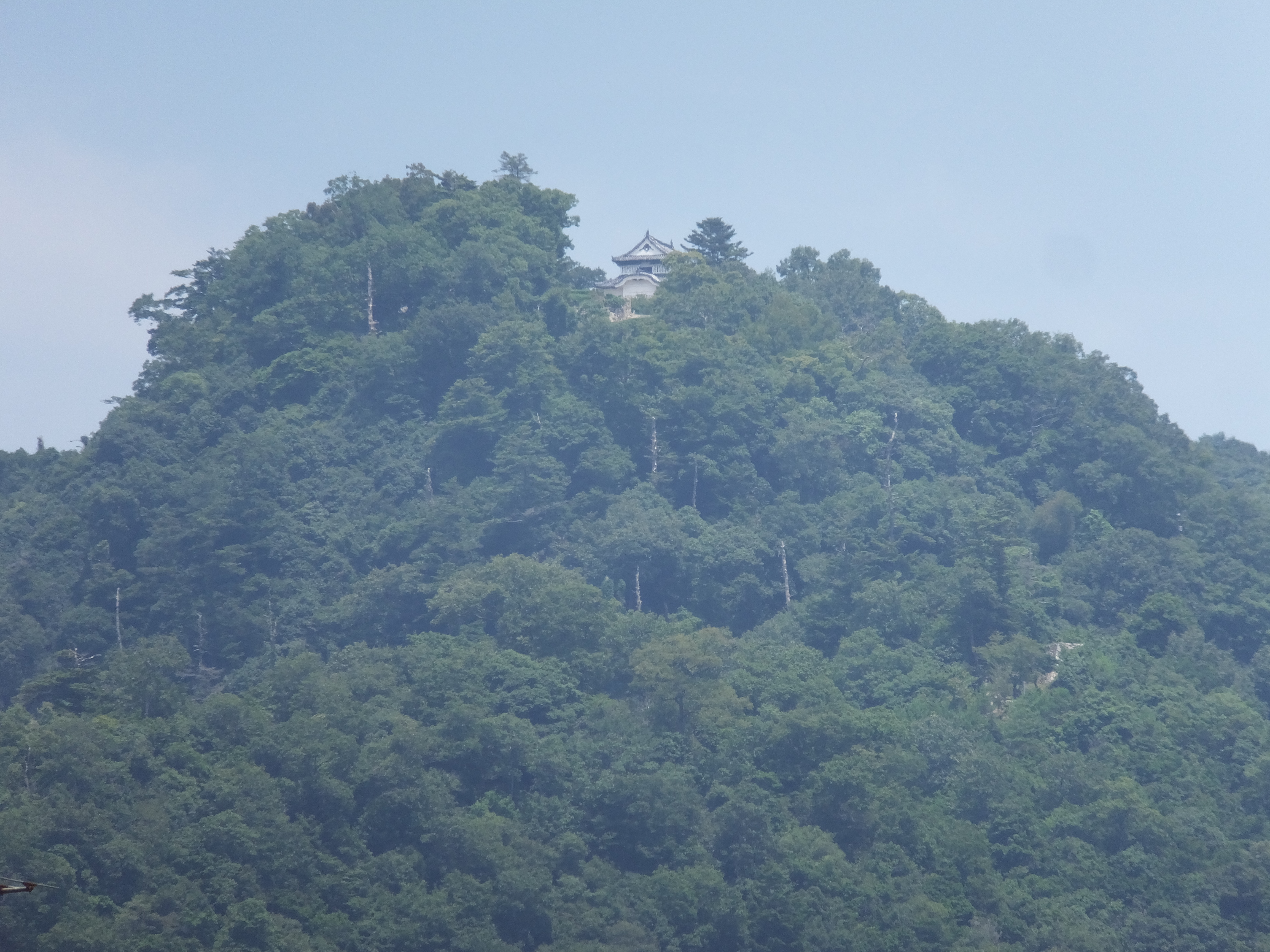 備中松山城の遠景 高梁駅前から見上げると天守の上部と中太鼓櫓の石垣 コンパクトデジカメで20倍で撮影 |