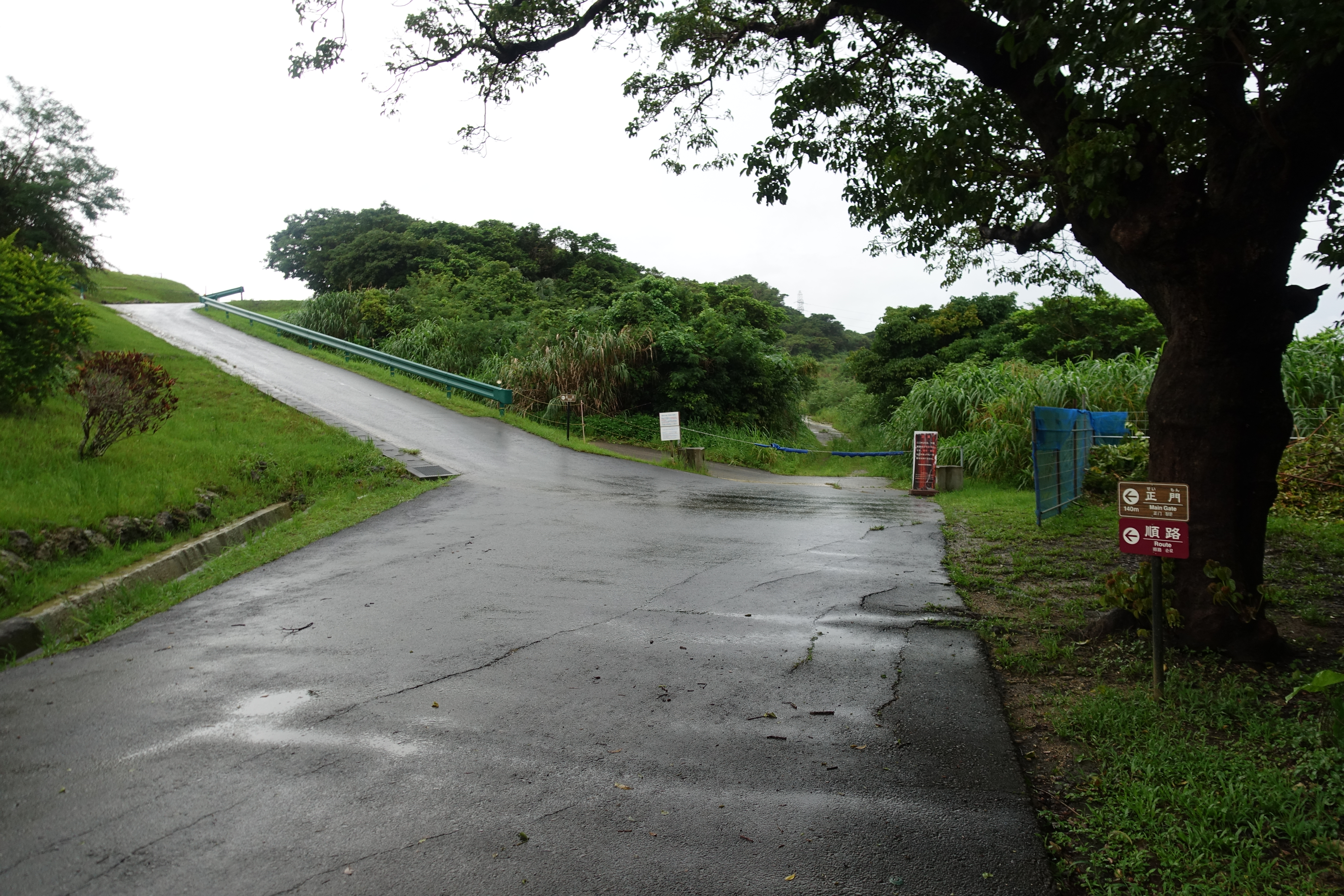 正門エリア(西の郭へ) 左は西の郭へ続く舗装道 (西の郭の石垣が右端のみの様で、少し残念)