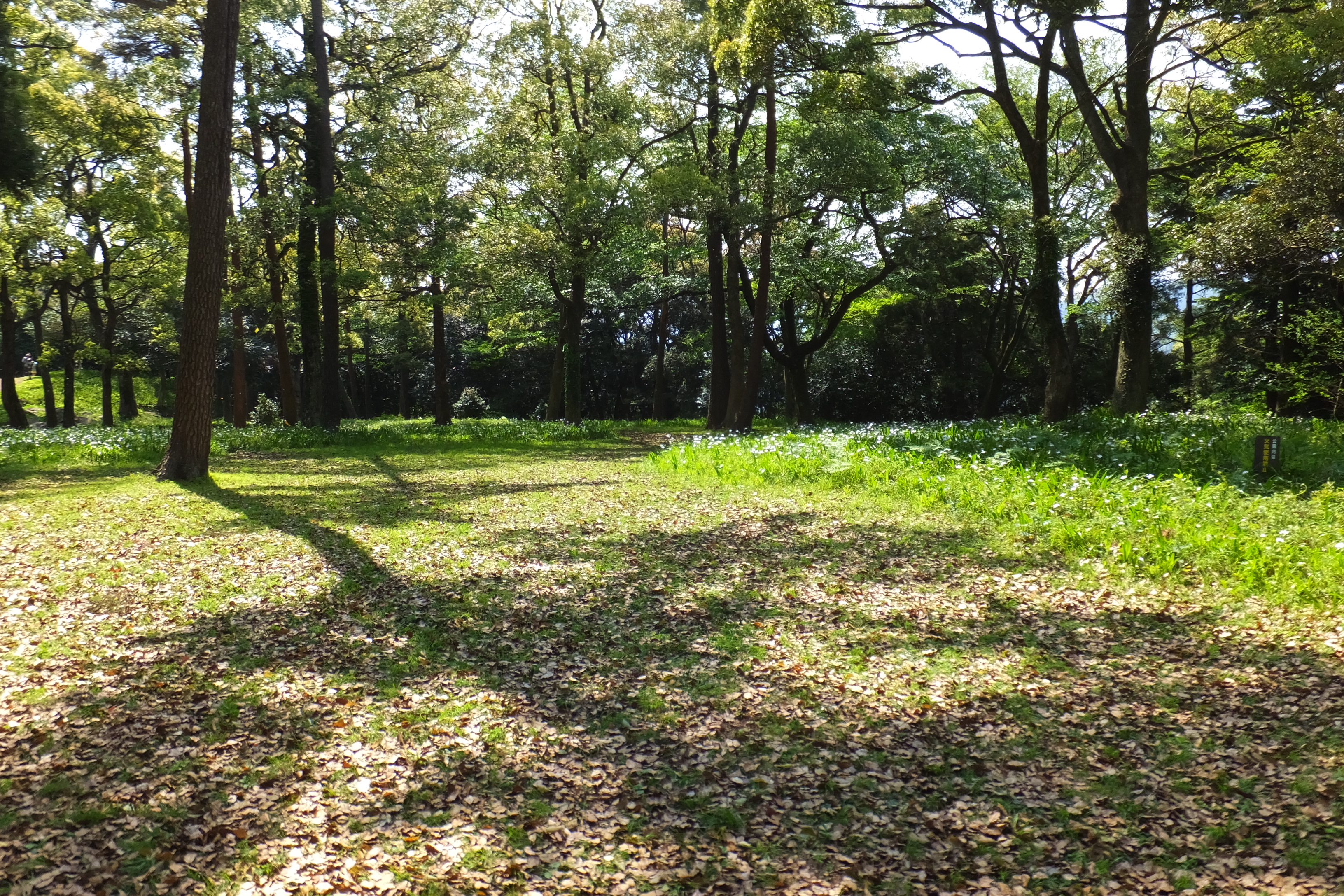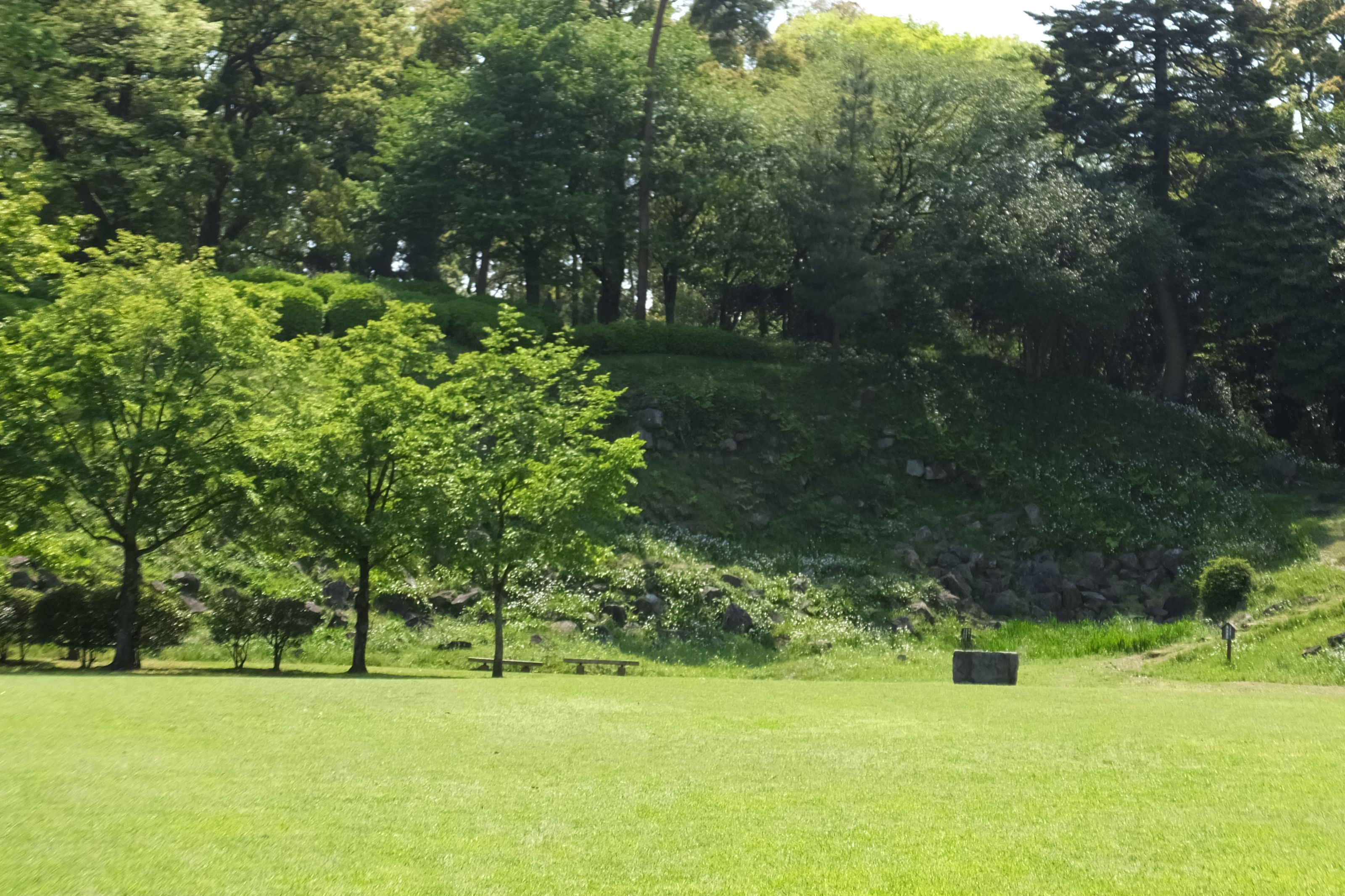 二の丸 芝生広場で木陰もあり、ピクニックに打って付けか 奥は本丸石垣 |