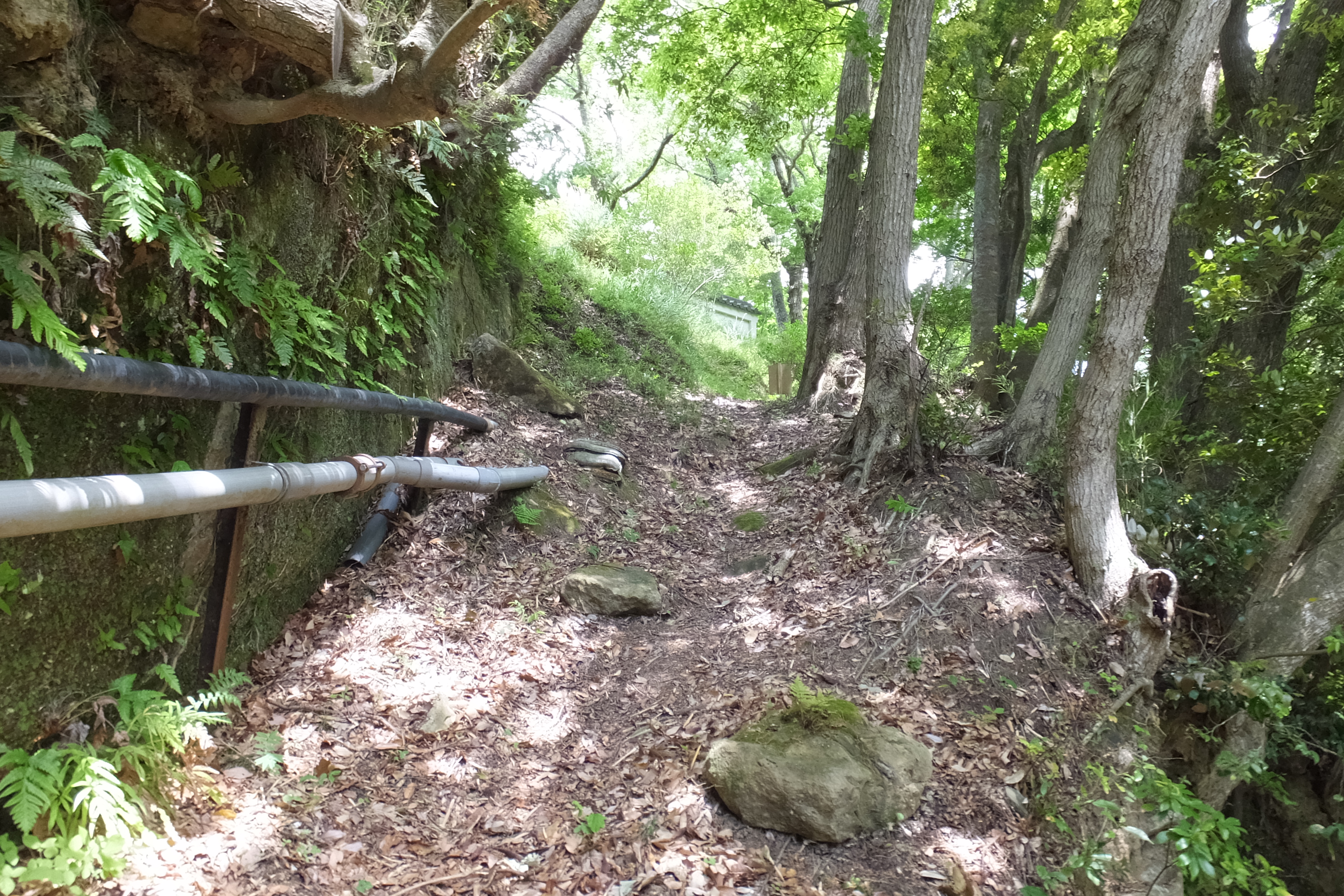 城道は、山鳥の威嚇する様な啼声が聞こえ、少し怖い感じでが…。 城道の最上部で、奥に二ノの丸のエリアを示す塀が見えます。