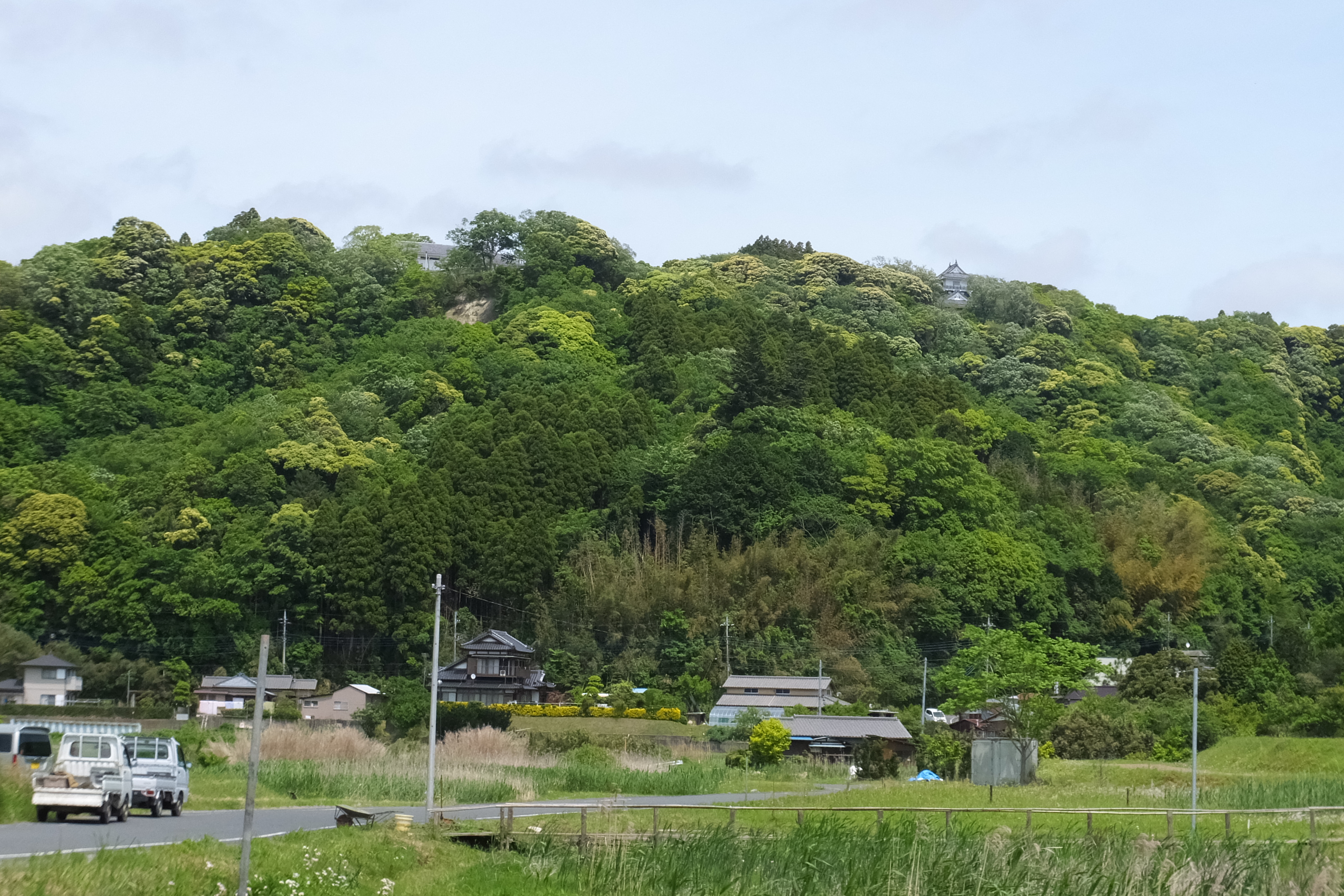 外曲輪の水掘跡近辺から望んだ山上エリア 模擬天守が城址の位置を示してくれます